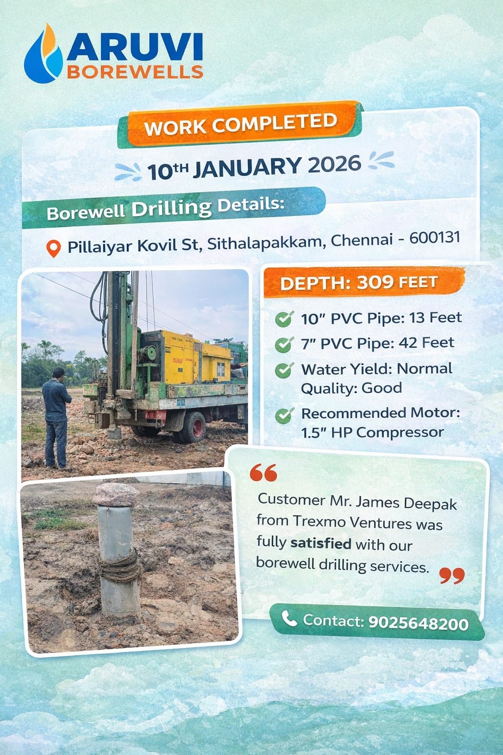 • “I am very satisfied with the borewell drilling service provided by ARUVI BOREWELLS. The team explained the drilling plan clearly and completed the work professionally. Water was found from 35 feet, with good yield and excellent water quality. Quality Finolex ISI PVC pipes were used, and proper guidance was given for installing a 1.5 HP submersible pump. The work was completed on time and as promised. I strongly recommend ARUVI BOREWELLS for reliable borewell drilling services in Chennai.”— Mr. SivakumarUnamancheri, Kolapakkam, Chennai – 600127